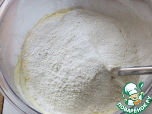 Добавить просеянную муку с крахмалом и разрыхлителем. всё аккуратно перемешать ложкой.