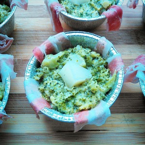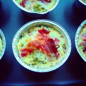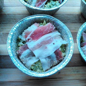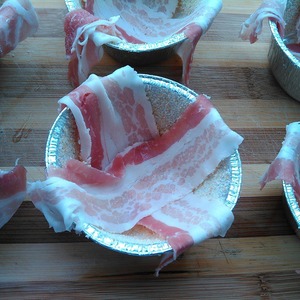 Смазать сливочным маслом и обсыпать манной крупной 6 формочек для пудинга. сверху положить "скрещенно "две полоски бекона.