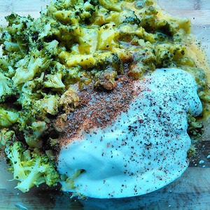 Мелко порезать брокколи. добавить сметану, яйца, по вкусу соль, перец, мускатный орех. хорошо перемешать.