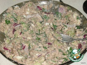 Вилкой размять рыбу, добавить измельчённые яйца, лук, зелень и огуречные семена. Посолить, поперчить по вкусу, добавить майонез и перемешать.