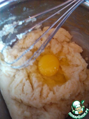 Делаем заварное тесто. Сначала ставим на огонь воду+масло+соль. Как закипит, всыпаем муку и тщательно размешиваем. Даем остыть и по одному вводим в тесто яйца.