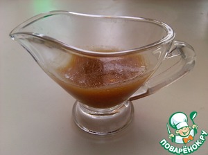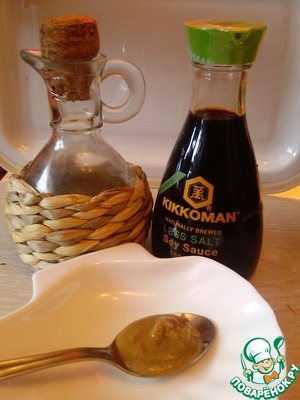 Для соуса горчицу, соевый соус "Киккоман" и масло взбить вилкой в пиалке