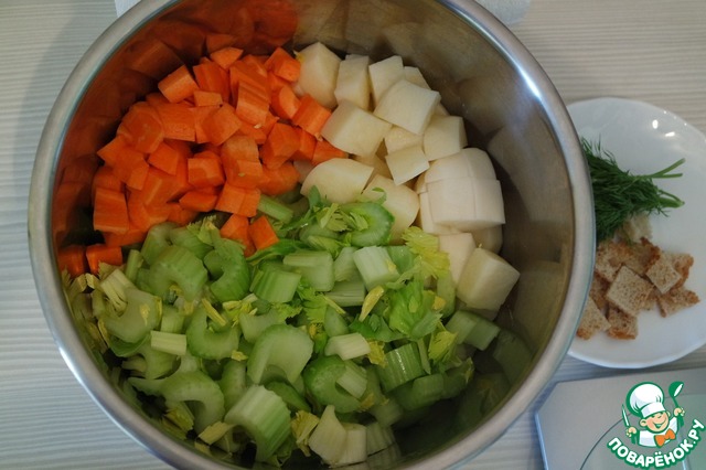 Морковь и картофель нарезать кубиками, сельдерей - кусочками. Залить 1 литром воды. Варить 20 минут.