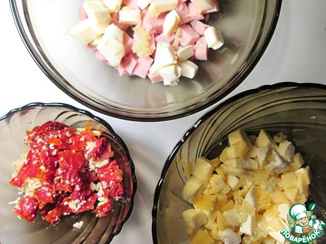 На самом деле, начинка для этих рожков - неограниченный простор для вашей фантазии. Я предлагаю лишь один из ее вариантов. Помидоры я брала вяленые, без масла. Промыла их, положила в кипящую воду на 2 минуты и дала настояться им в кипятке несколько часов, после чего мелко порезала. Если у вас есть вяленые помидоры в масле, просто сразу режем их небольшими кусочками. Со свежим помидором поступаем также. Добавляем к ним 10 г тертого сыра и перемешиваем. Для второй начинки измельчаем блендером порезанные небольшими кубиками адыгейский сыр, 50 г плавленого и 30 г твердого сыра, 1 тертый зубчик чеснока, перчим по вкусу. Для третьей начинки измельчаем блендером ветчину, 50 г плавленого сыра и 1 тертый зубчик чеснока. Если крем получается слишком густым и неравномерно измельчается, добавим к нему 1-2 ч. л. сметаны.