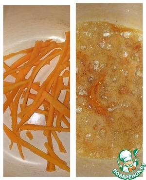 1. Для украшения нашинковать на терке (как для моркови по-корейски) немного моркови и отварить в сахарном сиропе.