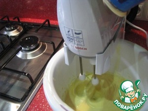 Разделяем яйца на желтки и белки. Белки убираем в холодильник (они нам еще пригодятся для безе). Желтки взбиваем со сгущенным молоком в очень хорошую пену, добавить цедру и сок лимона, все еще раз взбить и вылить в форму. Маленькое дополнение от себя, когда я взбиваю яйца, хоть вместе, хоть по отдельности (белки и желтки), я добавляю щепоточку соли, так взбивается быстрее и гуще. Целые яйца взбиваются комнатной температуры, желтки также комнатной температуры, а вот белки хорошо охлажденными.
