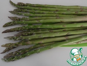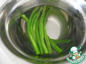 Саржу помыть, и отрезать концы, т. к. они жёсткие, затем вскипятить воду о отварить спаржу 5мин., затем сразу выложить в чашку с холодной водой на 5 мин., достать, обсушить и обжарить на оливковом масле 3 мин.
