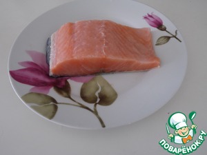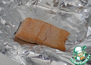 Небольшую форму для пирога застелить фольгой и сбрызнуть маслом. Филе лосося уложить в форму кожей вниз. Поместить рыбу в предварительно разогретую духовку, запекать 10 15 минут -