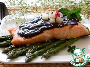 5. Поместить рыбу в предварительно разогретую духовку, запекать 10 15 минут. 6. Саржу помыть, и отрезать концы, т. к. они жёсткие, затем вскипятить воду о отварить спаржу 5мин., затем сразу выложить в чашку с холодной водой на 5 мин., достать, обсушить и обжарить на оливковом масле 3 мин.7. Достать рыбу и выложить на спаржу.8. Готовим соус наливаем соус Териаки в ковшик, добавляем мёд, имбирь, и крахмал помешать и в это время, растопить шоколад в микро, добавить шоколад к соусу, размешать, и через мин убрать с огня.9. Полить сверху рыбу.10. нарезать ананас кубиками выложить на соус, посыпать кунжутом и украсить мятой.