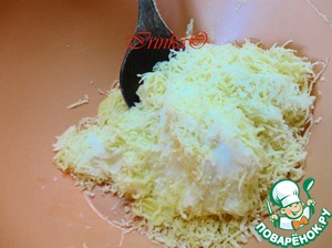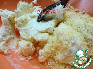 В глубокую миску кладем 200 г любого плавленого сыра-треугольничками, брикетами, мягкого типа в ванночках и 100 г сыра голландского или любого другого твердого, натертого на самой мелкой терке. Вообще-то, пропорции сыра можно брать любые, но вкуснее, если мягкого сыра больше.