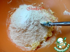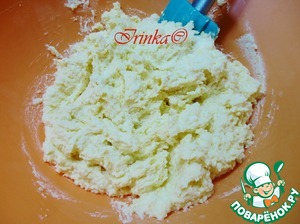 Добавляем 200 г размягченного сливочного масла, два яичных белка, половину чайной ложки соды.