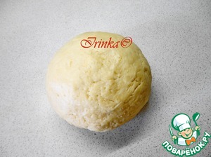 Затем выкладываем его на стол, подсыпаем остальную муку и хорошо вымешиваем. Тесто должно получиться плотным. Кладем его в миску, затягиваем пленкой и убираем в холодильник на два часа.