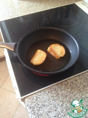 Два кусочка батона обжариваю на подсолнечном масле, чтобы образовалась румяная корочка. Если у вас твердый батон, то вымочите ломтики в молоке, но не переусердствуйте, чтоб батон не размяк в кашицу.