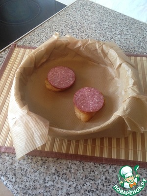 Обжаренные ломтики батона перекладываю в форму для запекания, застеленную пекарской бумагой. На каждый ломтик батона кладу тонко нарезанную колбаску.