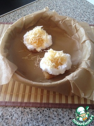 Самый мой волнительный момент. Признаюсь, манипуляции с "гнездом" у меня получились не сразу, да и сейчас, иногда, бывают неудачи. Если ты готовишь это блюдо первый раз, то, чтоб "гнездо" получилось, лучше тренироваться на батоне большего диаметра. Белок чайной ложкой выкладываю блином, потом бортики кольцом, в центр аккуратно желток, посыпаю все специями и тертым сыром. не расстраивайся, если "гнездо" съедет, тут нужна тренировка. Ставлю в разогретую духовку на 220 градусов. Моей духовке хватает около 7 минут. Ориентируйся по цвету белка, должен подрумянится.