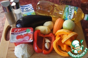 Картофель, сельдерей и тыква взвешены уже очищенными, баклажан - в кожице. Помидоры сейчас невкусные, и я предпочитаю использовать готовые протертые помидоры или их мякоть, в супермаркетах есть разные варианты.