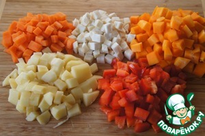 Овощи тщательно вымыть и очистить. Затем всё, кроме чеснока и лука, нарезать небольшими кубиками, чеснок - тонкими пластинками.