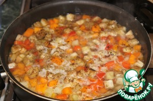 Влить горячий бульон или воду, довести до кипения, посолить, поперчить и готовить на маленьком огне 20-25 минут.