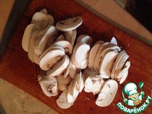 • После того как лук поджариться, резанные шампиньоны добавить к луку. Не накрывайте сковороду крышкой, иначе рискуете получить тушеные грибы вместо обжаренных).