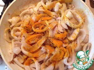 • Дайте кальмарам немного схватиться. Только после этого добавляем куркуму, розмарин, свежемолотую смесь перцев и соль. Прогреваем специи. Как только слышим аромат специй...