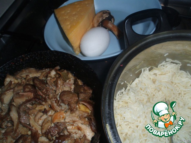 Мясо нарезается полосками, лук и грибы тоже. Пережариваем. Солим, перчим.