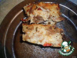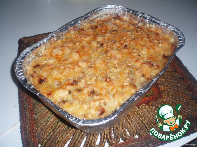 Выкладываем смесь. Посыпаем оставшимся сыром. На 30 -35 мин. в духовку. Когда достанете, никуда не отлучайтесь, если кто-то есть дома. Потому что возвратясь, вы рискуете услышать фразу: "А мы тебе кусочек оставили.. "