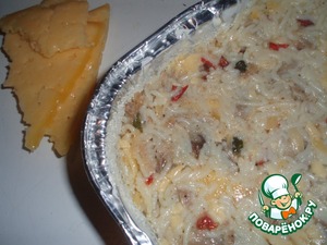 Можно приправку добавить, зелень. Перемешиваем с вермишелью. У меня было 2 полные ст. ложки. Я ее положила только для скрепления. Добавляем взбитое яйцо и половину тертого сыра. Опять перемешиваем. Хорошенько смазываем маслом форму, у меня одноразовая - удобная вещь. Обсыпаем манкой.