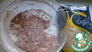В миске смешать сухие ингредиенты. Муку, какао, разрыхлитель, тростниковый сахар. Ввести растопленное сливочное масло, яйцо. Кофе залить кипятком, добавить к полученной массе. Хорошо перемешать.