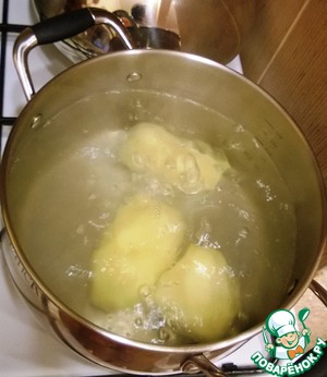 Для начала отварим в 1,5 л воды три картофелины. Воду солить не нужно.