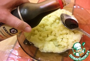 Займемся клецками. В чуть остывшее картофельное пюре добавим соевый соус (у меня "Киккоман") и ложку растительного масла. Тоже можно полчайной ложечки хмели-сунели или молотого кориандра добавить. Хорошо перемешаем.