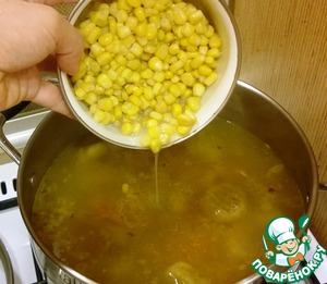 Минут через 15 совместного кипения полбы и зажарки кладем в кастрюлю клецки и полбанки консервированной кукурузы с жидкостью. Если используете мороженую кукурузу, то ее лучше положить сразу после зажарки, и пусть покипят вместе минут 10, а затем уж – клецки.