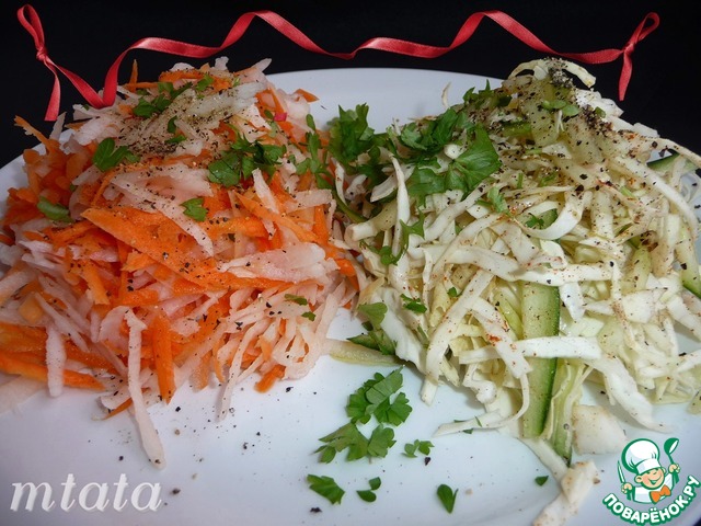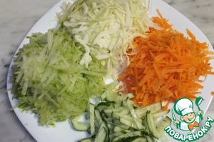 Капусту нашинковать. Морковь и редьку потереть на крупной тёрке.