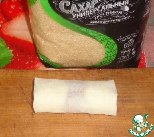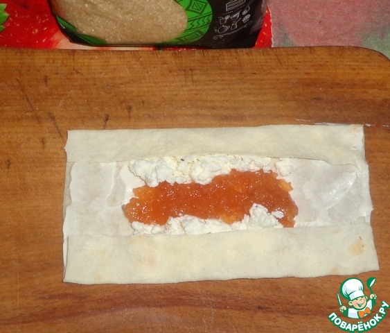 Тонкий лаваш разрезаем на прямоугольники. Смазываем каждый прямоугольник сметаной. На середину кладем около 1 ч. л. яблочного повидла, а по краям повидла выкладываем творог. |