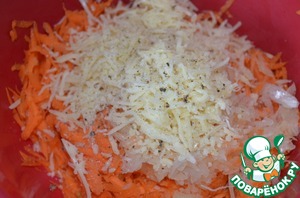 • Смешать в миске с тертым сыром, зирой, солью и перцем.