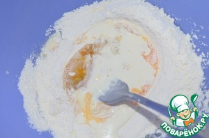 • Добавить молоко и соду и ещё раз хорошо взбить, чтобы не было комочков. Муки может уйти больше, смотрите, чтобы консистенция теста была, как жидкая сметана.