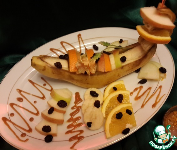 Необычная подача в банановой кожуре обычных фруктов. Соленая карамель подчеркивает вкус фруктов