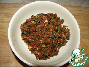 Петрушку, шпроты ( анчоусы), острый перчик и чеснок, мелко нарезать