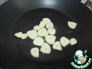 В глубокую сковородку налить растительное масло и обжаривать чеснок.