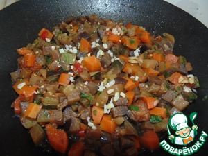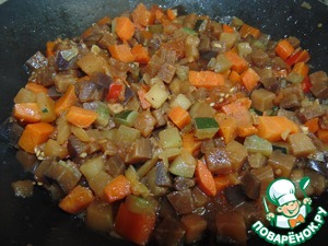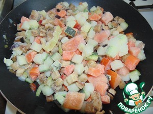 В чесночное масло выложить замороженную смесь " Овощное рагу" (кабачки, баклажаны, перец, помидоры, лук, морковь).