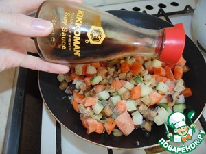 Перемешать и тушить в соевом соусе, под крышкой, на медленном огне.