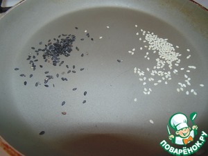 Взять чуть-чуть кунжута и прокалить его на сухой сковороде 30 секунд.
