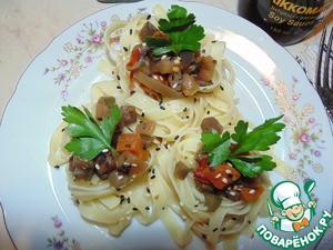 Выложить на тарелку по 3 гнезда на порцию. У меня они развалились, подкручивала вилкой. В гнёзда выложить овощи и посыпать кунжутом.