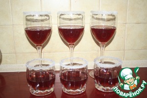 Разлить сок по бокалам. У меня получилось 3 бокала по 0,28 л и 3 бокала по 0,2 л (объем до края бокала). Прежде чем залить сок, я сделала сахарный бортик на бокале. Для этого нужно перевернуть бокал и окунуть в небольшой слой воды, затем сахара. Отправить в холодильник для застывания желе на час-полтора.