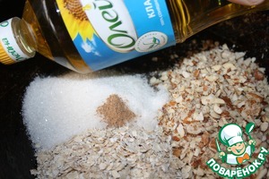 Готовим грильяж. Для этого перемалываем орехи до крупной фракции. На сковороде разогреваем растительное масло, добавляем сахар, овсяные хлопья, корицу, орехи. Жарим на среднем огне, постоянно помешивая до карамелизации сахара.
