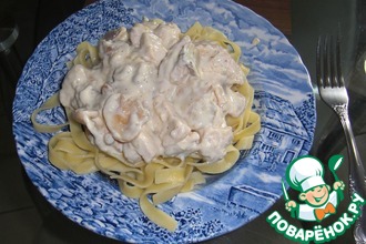 Обжаренные куриные филе разрезаем на более мелкие куски, выкладываем в соус и оставляем протомиться на слабом огне минут 10.