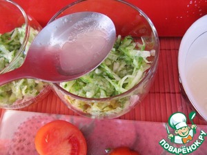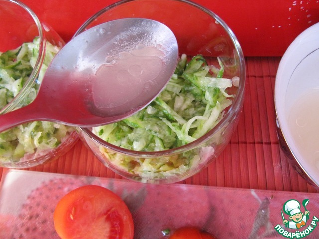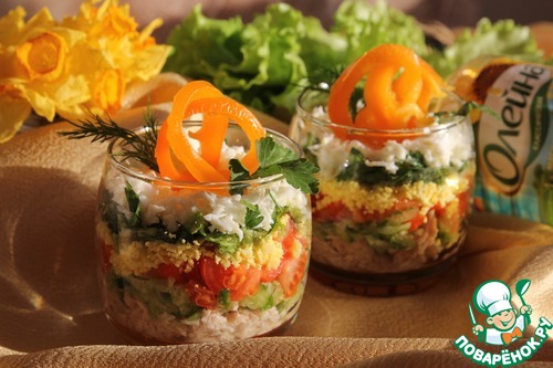 7. Выложить слоями в красивые стаканы. Первый слой индейка, потом огурец, полить соком с маслом