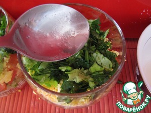 9. На самый верх положите белки и украсьте по желанию. Я украсила болгарским перцем и зеленью.