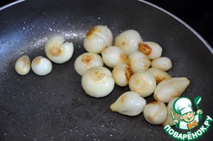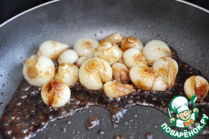 Берём лук-шалот или мелкий репчатый лук, чистим и обжариваем до румяности на растительном масле, постоянно встряхивая сковороду.