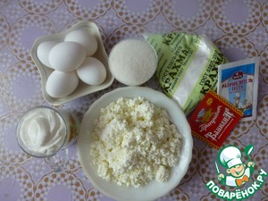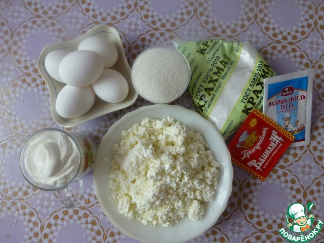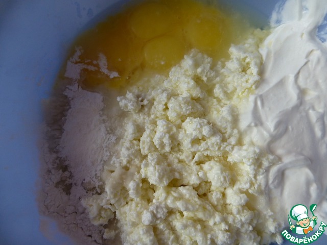 Смешать в чашке творог, желтки, добавить сметану, крахмал, ванилин, разрыхлитель или соду. Всё взбить блендером.