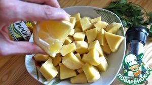 • Картофель, перемешивая, сбрызгиваем лимонным соком (если крупный лимон, то 1/4 лимона, если небольшой, то 1/3).